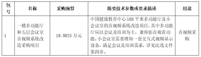 中国健康教育中心就 “一楼多功能厅和五层会议室音视频系统改造采购项目”进行比选采购,现邀请合格供应商参加比选响应。