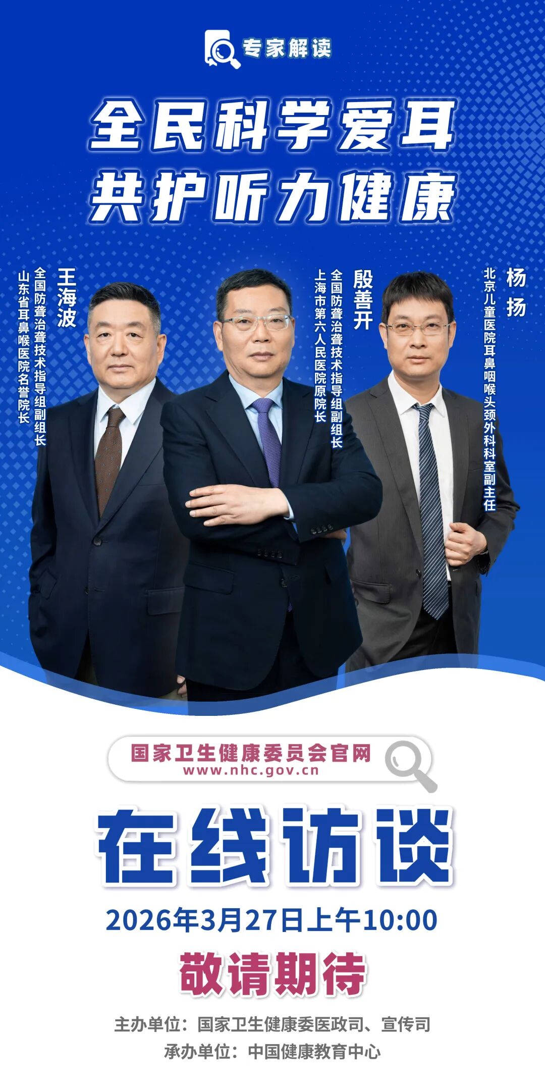 【预告】国家卫生健康委在线访谈《全民科学爱耳 共护听力健康》,3月27日上午10点,敬请关注!